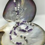 Collier sautoir de 85 cm en Améthyste, Labradorite, Quartz Rose et Howlite d’Afrique. Perles de 6 et 8mm, fermoire acier inoxydable. Se porter en une seule longueur ou doublé autour du cou.