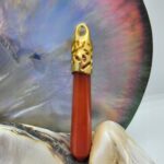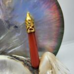 Pendentif en cornaline en forme de pointe, délicatement serti en acier inoxydable couleur OR, avec des découpes ornementales . Longueur total env. 6 cm