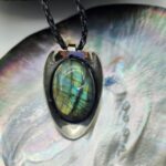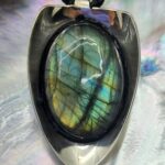 Pendentif unique réalisé à partir d’une ancienne cuillère en argent recyclée, sublimé par une magnifique Labradorite aux reflets lumineux .